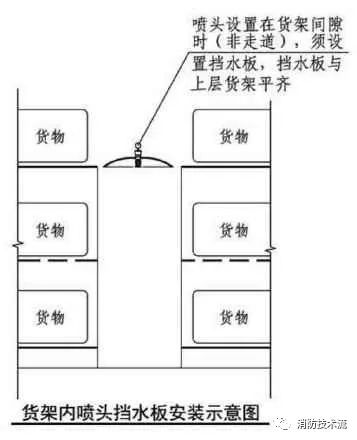 1 設(shè)置貨架內(nèi)置灑水噴頭的倉庫,當(dāng)貨架內(nèi)置灑水噴頭上方有孔洞、縫隙時,可在灑水噴頭的上方設(shè)置擋水板;
