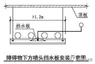 2 寬度大于本規(guī)范第7.2.3條規(guī)定的障礙物( 當(dāng)梁、通風(fēng)管道、成排布置的管道、橋架等障礙物的寬度大于1.2m時;采用早期抑制快速響應(yīng)噴頭和特殊應(yīng)用噴頭的場所,當(dāng)障礙物寬度大于0.6m時。),增設(shè)的灑水噴頭上方有孔洞、縫隙時,可在灑水噴頭的上方設(shè)置擋水板。