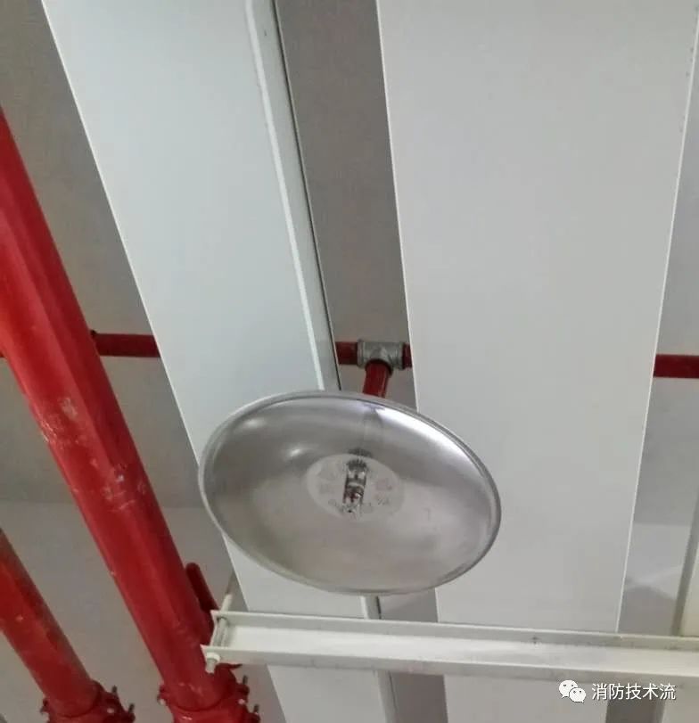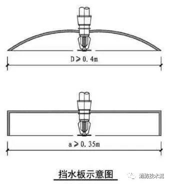 擋水板應(yīng)為正方形或圓形金屬板,其平面面積不宜小于0.12m2,周圍彎邊的下沿宜與灑水噴頭的濺水盤平齊。除下列情況和相關(guān)規(guī)范另有規(guī)定外,其他場所或部位不應(yīng)采用擋水板