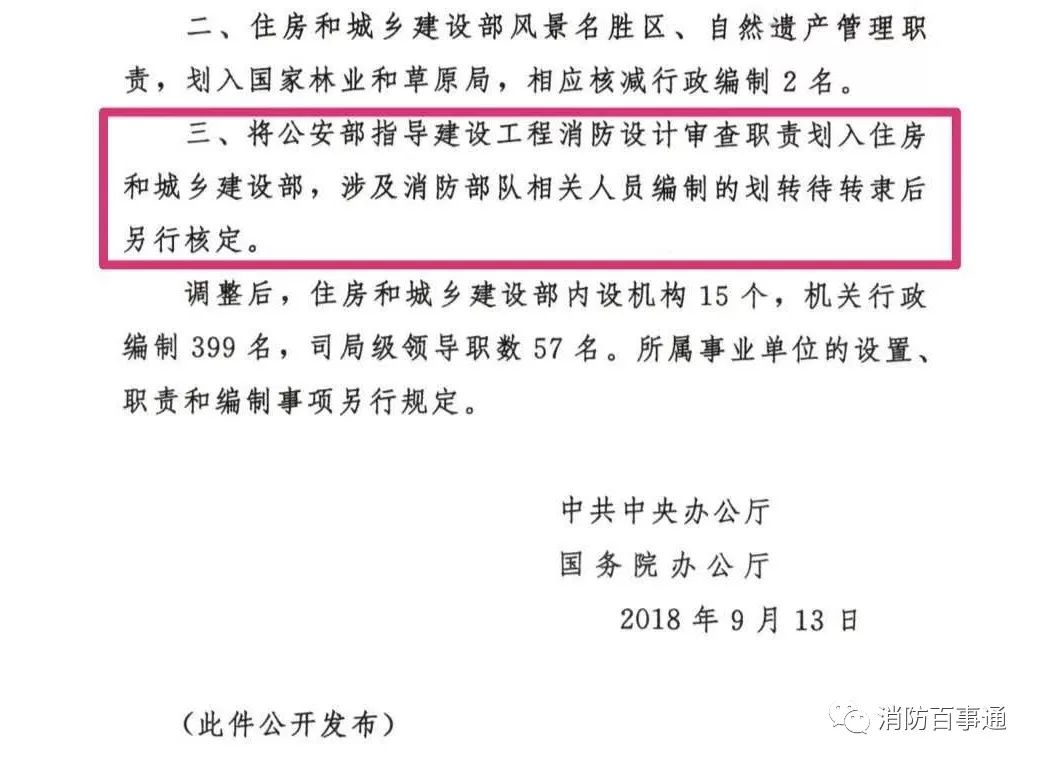 此前中央辦公廳曾正式發(fā)文,將公安部指導(dǎo)建設(shè)工程消防設(shè)計審查職責(zé)劃入住房和城鄉(xiāng)建設(shè)部,涉及消防部隊相關(guān)人員編制的劃轉(zhuǎn)待轉(zhuǎn)隸后另行核定。