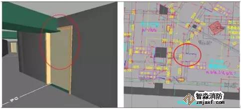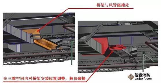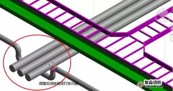 上述圖中,淺藍(lán)色部分是橋架,綠色部分是風(fēng)管,紅色部分是消防水管,圖中通過碰撞檢查可以看出左圖中發(fā)生兩處比較嚴(yán)重的碰撞,紅色圈分別畫出錯誤的部位,一個是防火橋架和風(fēng)管的碰撞,另外一個是消防水管與其他管道發(fā)生碰撞,通過BIM中的碰撞檢查可以將它們進(jìn)行有效地調(diào)整,小管優(yōu)先避讓大管,避免在現(xiàn)場中發(fā)生管道打架的情況。