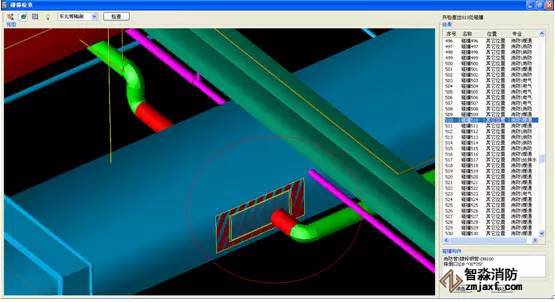 BIM技術(shù),即將施工的建筑和機(jī)電設(shè)備管線進(jìn)行三維建模,并采用BIM技術(shù)中具有可視化模型及碰撞檢測功能,對現(xiàn)有信息模型進(jìn)行碰撞檢查,可直觀地發(fā)現(xiàn)管線綜合中的問題,及時調(diào)整,從而減少了施工中不必要的返工,提高了消防工程安裝的一次成功率,從而達(dá)到工程對標(biāo)高及施工質(zhì)量的高要求。