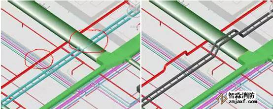 當(dāng)消防系統(tǒng)與機(jī)電總包的風(fēng)管發(fā)生碰撞時,如圖所示: