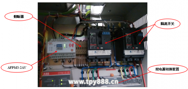 本商場綜合樓項目的AFPM3-2AV三相交流雙電源電壓傳感器安裝于斷路器或隔離開關(guān)的輸出端和雙電源切換裝置的輸入端之間,主電源電壓信號接1,2,3,4這四個端子,備用電源電壓信號接5,6,7,8這四個端子,以位于地下室區(qū)域的消火栓泵配電箱雙電壓監(jiān)控為例,傳感器AFPM3-2AV安裝位置示意圖如圖2所示,實物安裝位置圖如圖3所示,電壓信號接線示意圖如圖4所示。
