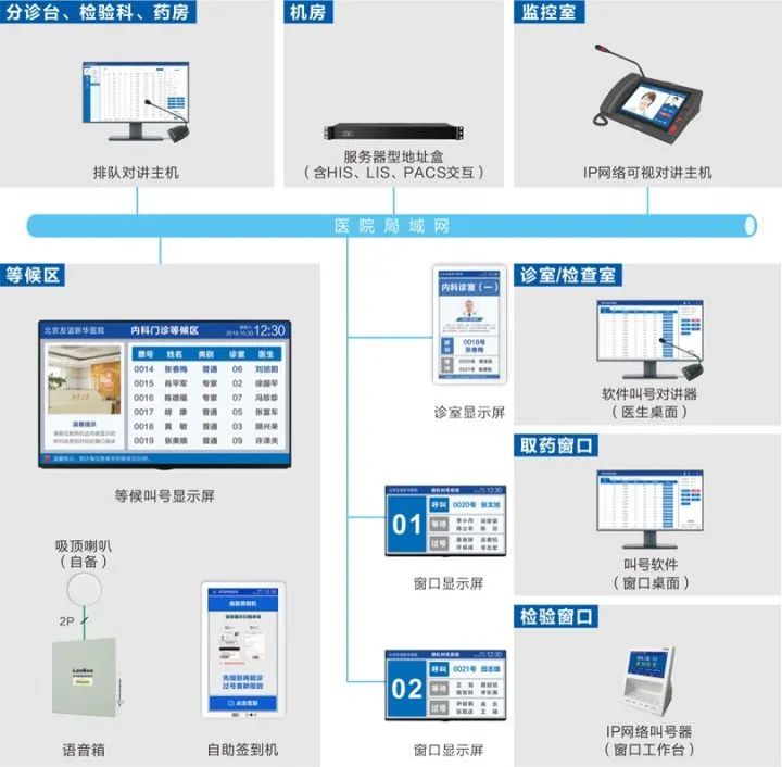 系統(tǒng)采用6類網(wǎng)線,網(wǎng)絡(luò)式架構(gòu);候診區(qū)設(shè)置IPTV電視及復(fù)診自助簽到機(jī);每診室設(shè)置1臺顯示屏;門診樓設(shè)置LED大屏、LED條屏;急診、出入院辦理、收費窗口、取藥處、采血處設(shè)置窗口顯示屏。
