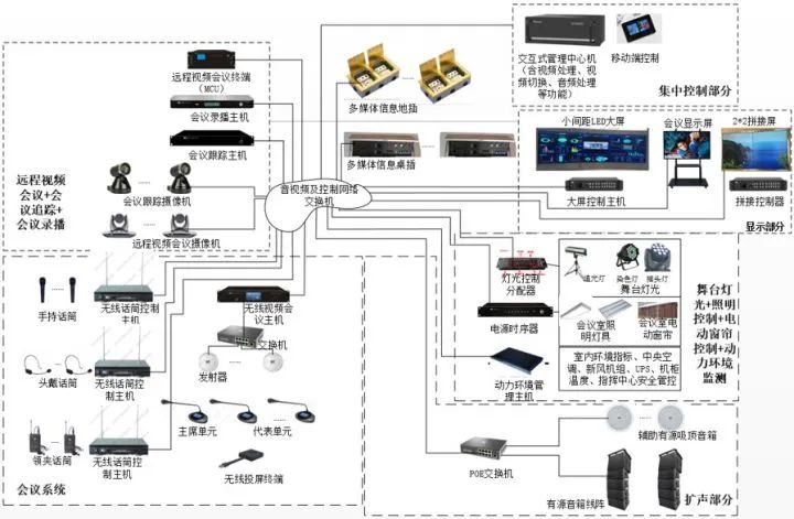 大會議室/多功能廳滿足會議、指揮、監(jiān)控、展示、分析、匯報、小型報告會、演出等8大使用需求,中型會議室/小會議室滿足展示、分析、匯報、會議等4大使用需求。系統(tǒng)采用網(wǎng)絡(luò)式架構(gòu)、包括大屏幕顯示、集中控制系統(tǒng)、視頻會議系統(tǒng)、擴(kuò)聲系統(tǒng)、無線視頻分享系統(tǒng)、會議簽到系統(tǒng)、會議錄播系統(tǒng)、舞臺燈光系統(tǒng)、動力環(huán)境監(jiān)測。