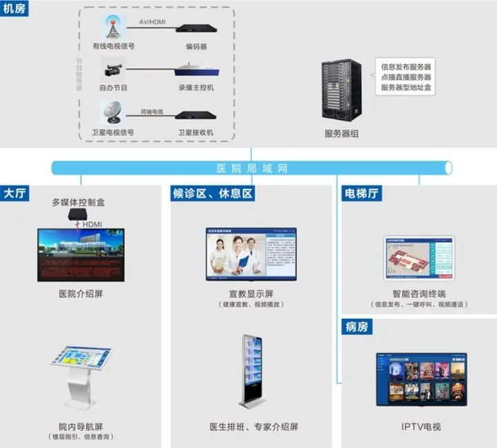 系統(tǒng)采用6類網(wǎng)線,網(wǎng)絡(luò)式架構(gòu);每病房設(shè)置1臺IPTV電視;電梯前室設(shè)置1臺信息發(fā)布一體機(jī);候診區(qū)設(shè)置IPTV電視及信息發(fā)布一體機(jī),門診樓和住院樓的一層大廳,設(shè)置P2.5小間距LED大屏及自助查詢一體機(jī)、門診樓設(shè)置LED大屏、LED條屏,西門、連廊處通道門設(shè)置LED條屏。