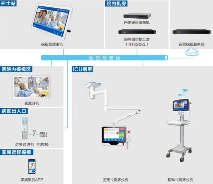 ICU病房探視系統(tǒng)連接于醫(yī)院內(nèi)網(wǎng),設(shè)置于住院樓六層ICU病房區(qū),ICU病房區(qū)采用移動式病房分機(jī)。