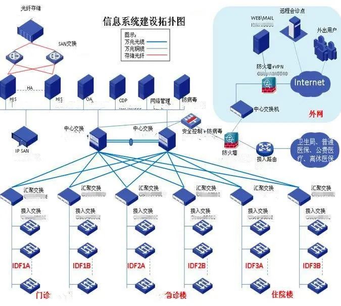 • 綜合布線內(nèi)網(wǎng)--辦公網(wǎng)綜合布線外網(wǎng)--連接Internet設(shè)備網(wǎng)--智能化網(wǎng)專網(wǎng)--連接衛(wèi)生局、醫(yī)保