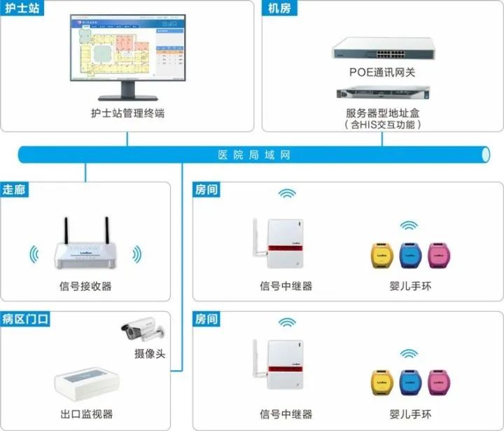 嬰兒防盜系統(tǒng)連接醫(yī)院外網(wǎng),設(shè)置于住院樓3層產(chǎn)科區(qū)病房、4層VIP科區(qū)病房+一體化家患產(chǎn)房、5層月子房;實時定位嬰兒位置、可形成運(yùn)動軌跡圖,家屬可通過APP查看。