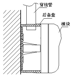 B-9310模塊后備盒與各類模塊的接線管路明裝時(shí)配合使用,可先根據(jù)工程現(xiàn)場(chǎng)情況,選擇后備盒底的一組合適的安裝孔,將后備盒安裝到墻壁上;再在后備盒側(cè)壁的適當(dāng)位置根據(jù)穿線管尺寸打進(jìn)線孔(也可在后備盒未安裝前打孔),將線接入后備盒后安裝模塊。安裝圖如圖: