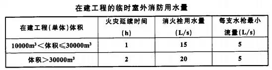 3、臨時(shí)室外消防用水量應(yīng)按臨時(shí)用房和在建工程的臨時(shí)室外消防用水量的較大者確定,施工現(xiàn)場(chǎng)火災(zāi)次數(shù)可按同時(shí)發(fā)生1次確定。