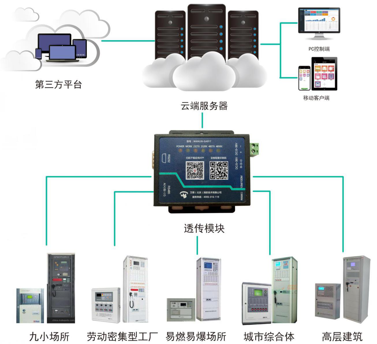 以上問題通過智慧消防解決,應用現(xiàn)代互聯(lián)網路由器等技術實現(xiàn),無需穿管做線等施工,只需要采用傳統(tǒng)消防主機+傳輸GA917傳輸模塊,數(shù)據(jù)傳輸采用232/485等通訊協(xié)議,采用intent網線數(shù)據(jù)傳輸(或4G),設備供電采用消防主機供電,無需備用電源也不用單獨拉線,只需要有網線即可,設備唯一MAC地址識別性,安裝海灣公安APP,可以通過手機APP進行參數(shù)設置,將消防主機數(shù)據(jù)實時進行遠程傳輸。海灣公安APP的賬號可以登錄客戶端集中管理平臺(智慧消防網絡CRT云平臺系統(tǒng)),將30個消防主機報警信息通過這個CRT云平臺管理,該平臺支持多個用戶管理(甲方、施工方、維保單位、消防支隊等),每個消防報警主機的點位都可以通過該平臺實時監(jiān)測火警、故障等報警信息。