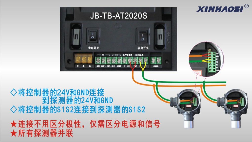 我們總線制的探頭采用的是我司自主研發(fā)設(shè)計的HBUS四總線通訊,控制器以及探頭上都有相對應(yīng)的24V、GND、S1、S2四個接線端子,只需將四個接線端子對應(yīng)相接即可;