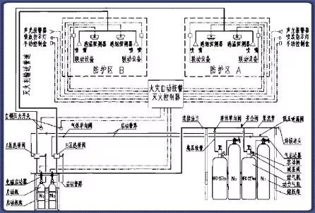 該系統(tǒng)由滅火劑瓶組、加壓氣體瓶組、驅動氣體瓶組(可選)、單向閥、選擇閥、減壓裝置、驅動裝置、集流管、連接管、噴頭、信號反饋裝置、安全泄放裝置、控制盤、檢漏裝置、管道管件及吊鉤支架等組成。