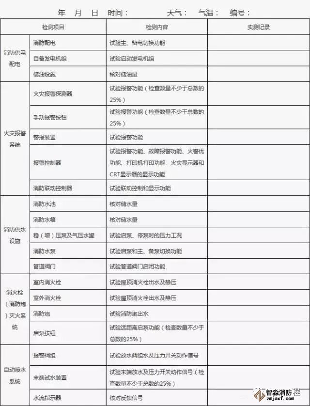 1、建筑消防設(shè)施的單項(xiàng)檢查應(yīng)當(dāng)每月至少一次,并填表。