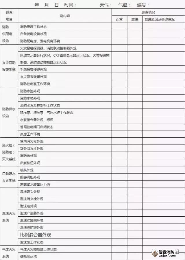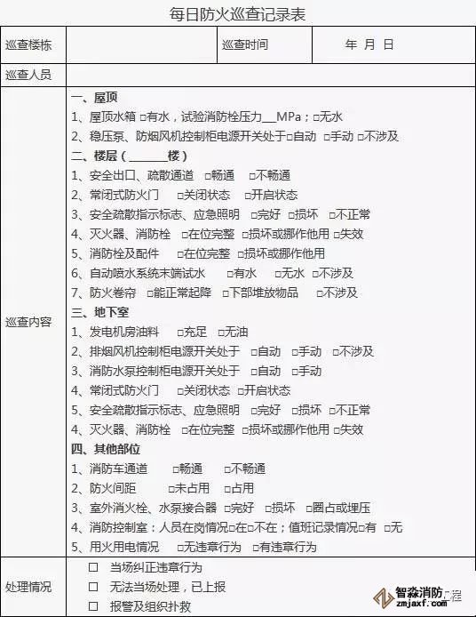 3、對(duì)發(fā)現(xiàn)的問題應(yīng)及時(shí)處理,當(dāng)場(chǎng)不能處置的要填報(bào)《建筑消防設(shè)施故障處理記錄》。