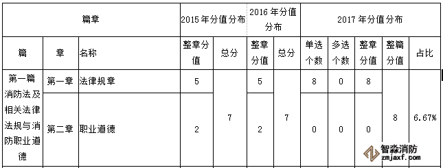 2017年一消綜合能力考試,第一篇所占分值為8分,每個(gè)章節(jié)所占分值發(fā)生了變化,第二章未出相關(guān)考點(diǎn),而第一章法律規(guī)章所占分值為8分。