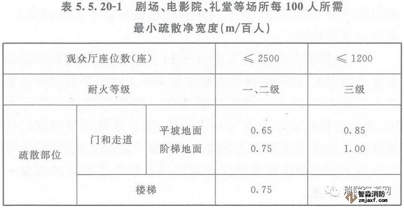 2、劇場、電影院、禮堂等場所供觀眾疏散的所有內(nèi)門、外門、樓梯和走道的各自總凈寬度,應(yīng)根據(jù)疏散人數(shù)按每100人的最小疏散凈寬度不小于表5.5.20-1的規(guī)定計算確定;