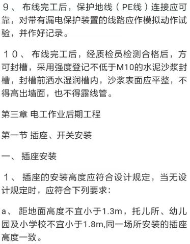9、 電工作業(yè)后期完工后,應對插座、開關、燈具等進行檢查試用,應符合《電氣安置、安裝工程電氣設備交接試驗標準》是有關規(guī)定,并作好記錄。