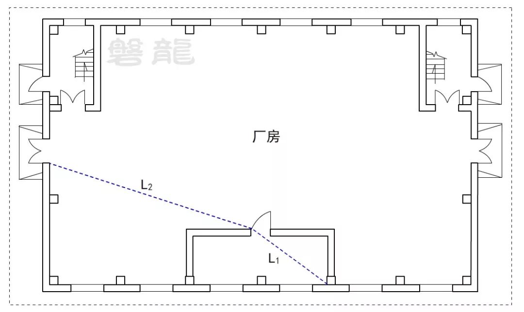 2、廠房倉庫同樣不應采用嵌套(穿套)設(shè)置的方式,確因功能需要,嵌套(穿套)設(shè)置的房間不應超過一級,疏散距離應按人員行走的直線距離計算,在圖示6的廠房中,示例房間內(nèi)任一點至安全出口的直線距離,應為L1+L2。