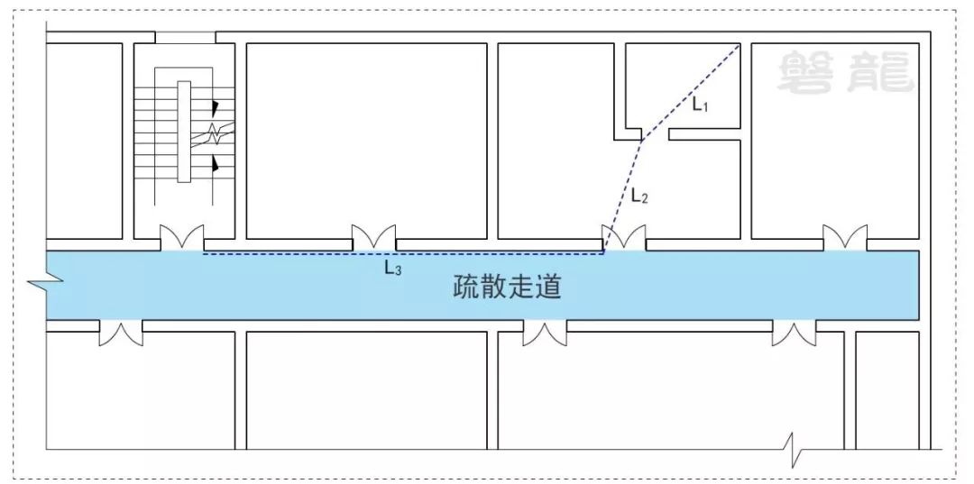 3、確因功能需要,嵌套(穿套)設(shè)置的房間不應超過一級,疏散距離應按人員行走的直線距離計算,在圖示4的公共建筑中,示例房間內(nèi)任一點至房間直通疏散走道的疏散門的直線距離,應為L1+L2。
