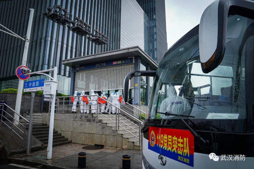 當天下午,武漢消防“119黨員突擊隊”15 名消防員進入武漢軌道交通 2 號線洪山廣場站內(nèi)進行科學消毒