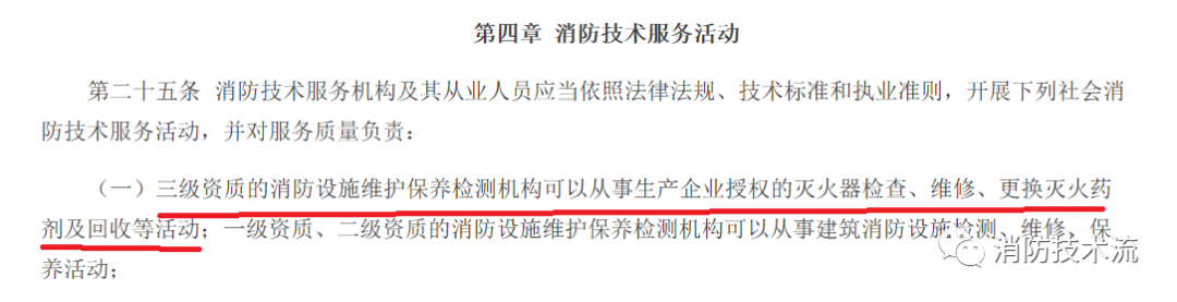 這與《消防技術服務機構從業(yè)條件》對應,因從業(yè)條件并沒有對滅火器維修機構作出規(guī)定。