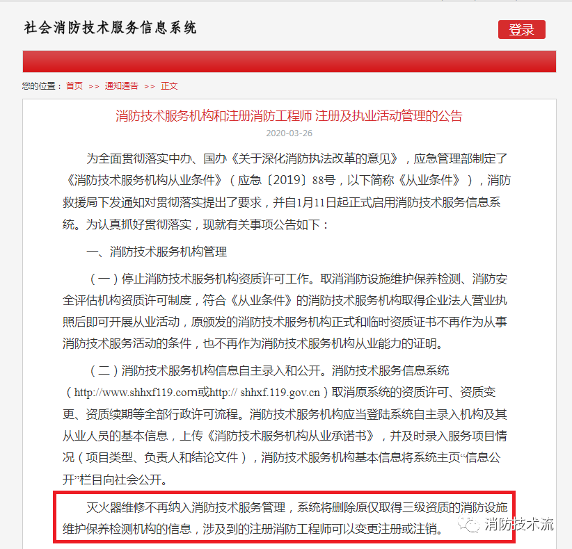 今天,社會消防技術服務信息系統(tǒng)轉發(fā)一則由江蘇消防救援總隊發(fā)布的《消防技術服務機構和注冊消防工程師注冊及執(zhí)業(yè)活動管理的公告》,其中明確滅火器維修不再納入消防技術服務管理,系統(tǒng)將刪除原僅取得三級資質(zhì)的消防設施維護保養(yǎng)檢測機構的信息。