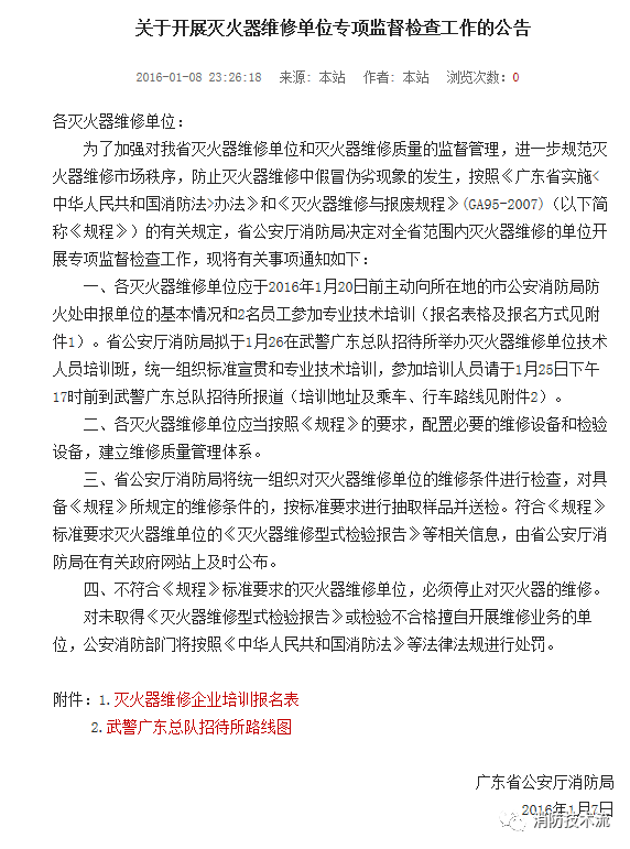 那現(xiàn)在滅火器維修單位的資質(zhì)如何辦理?這個目前還是個未知之數(shù)。以往,滅火器維修單位一直由消防部門監(jiān)督管理,而廣東消防官網(wǎng)公示的最近一次開展滅火器維修單位專項監(jiān)督檢查工作是2016年,之后再無更新。