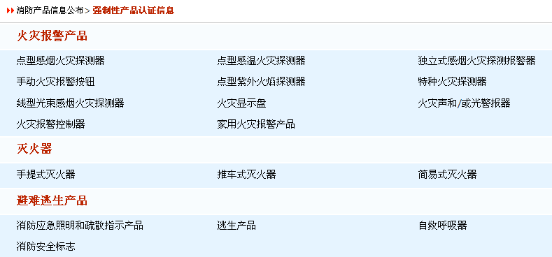從圖中我們可以看出,目前大品類包括三類,有火災(zāi)報警產(chǎn)品、滅火器和避難逃生產(chǎn)品,這些品類目錄下的消防產(chǎn)品是需要3C強制性認證的。每個大類下有包含子類。