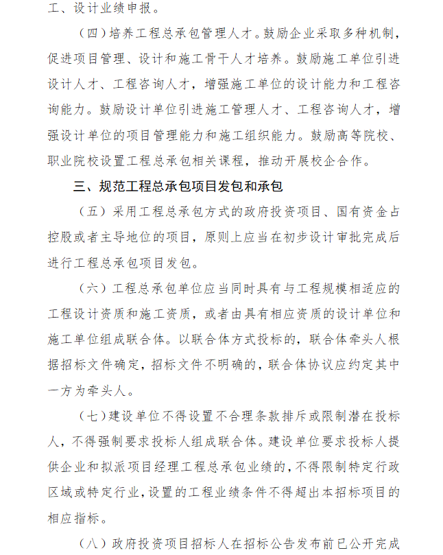 2、采用工程總承包方式的政府投資項(xiàng)目、國有資金占控股或者主導(dǎo)地位的項(xiàng)目,原則上應(yīng)當(dāng)在初步設(shè)計(jì)審批完成后進(jìn)行工程總承包項(xiàng)目發(fā)包。