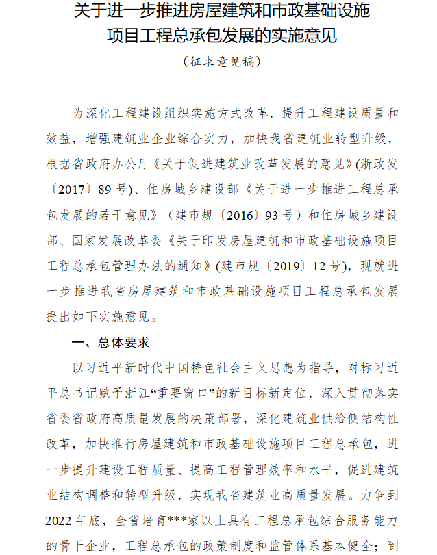 日前浙江省住建廳發(fā)布《關(guān)于進(jìn)一步推進(jìn)房屋建筑和市政基礎(chǔ)設(shè)施項(xiàng)目工程總承包發(fā)展的實(shí)施意見(征求意見稿)》。其中提出明確目標(biāo):