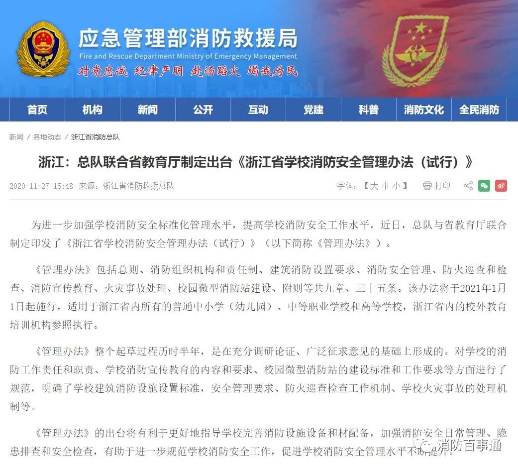 為進(jìn)一步加強(qiáng)學(xué)校消防安全管理,提高學(xué)校消防安全工作水平,結(jié)合浙江教育實(shí)際,我廳會同省應(yīng)急管理廳、省消防救援總隊聯(lián)合制定出臺《浙江省學(xué)校消防安全管理辦法(試行)》(以下簡稱《管理辦法》)。