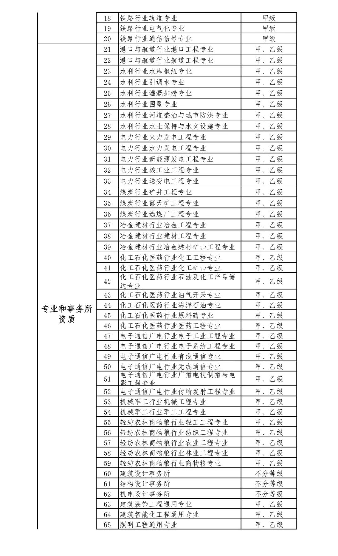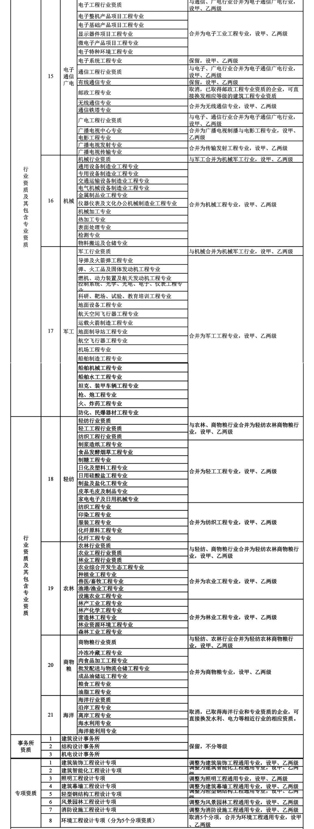 2.工程設(shè)計(jì)資質(zhì)。保留綜合資質(zhì);將21類行業(yè)資質(zhì)整合為14類行業(yè)資質(zhì);將151類專業(yè)資質(zhì)、8類專項(xiàng)資質(zhì)、3類事務(wù)所資質(zhì)整合為70類專業(yè)和事務(wù)所資質(zhì)。綜合資質(zhì)、事務(wù)所資質(zhì)不分等級;行業(yè)資質(zhì)、專業(yè)資質(zhì)等級原則上壓減為甲、乙兩級(部分資質(zhì)只設(shè)甲級)。