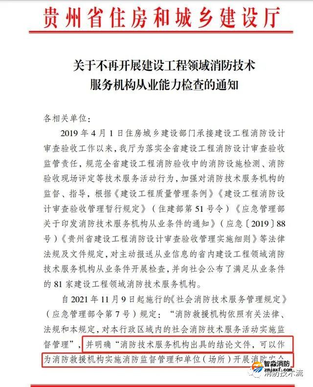 近日,貴州省住建廳發(fā)布通知,不再開展建設工程領域消防技術服務機構從業(yè)能力檢查,不再對《社會消防技術服務管理規(guī)定》(應急管理部令第7號)規(guī)定范圍內的消防技術服務機構實施監(jiān)督管理,并透露,住房城鄉(xiāng)建設部正在制定建設工程消防設計審查驗收技術服務機構從業(yè)標準