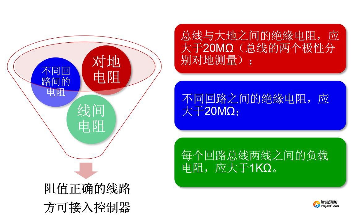 火災(zāi)自動(dòng)報(bào)警系統(tǒng)導(dǎo)線敷設(shè)后,在安裝現(xiàn)場(chǎng)設(shè)備之前,應(yīng)對(duì)每回路的導(dǎo)線用500V的兆歐表(搖表)測(cè)量絕緣電阻,其對(duì)地絕緣電阻值不應(yīng)