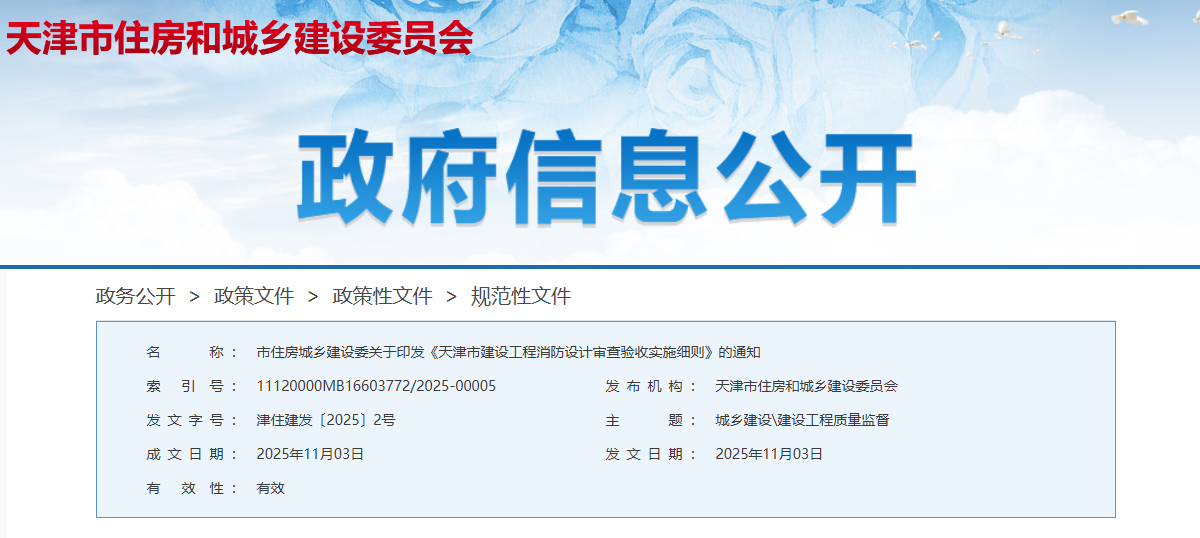 • 關(guān)鍵詞:《天津市建設(shè)工程消防設(shè)計(jì)審查驗(yàn)收實(shí)施細(xì)則》發(fā)布:明確分期驗(yàn)收、告知承諾制