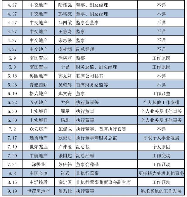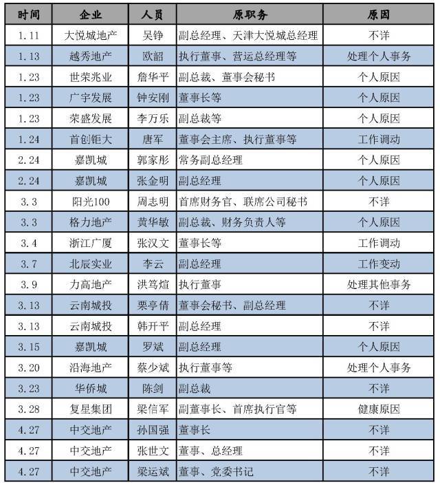 今年以來(lái)大部分房企高管的離職,都是自己提出辭呈,而公司公布的理由也是各有各的說(shuō)法,曾一度引發(fā)外界各種猜測(cè)。在各種離職原因中,出現(xiàn)頻率最高的是“個(gè)人原因”以及“工作變動(dòng)(或調(diào)動(dòng))”。