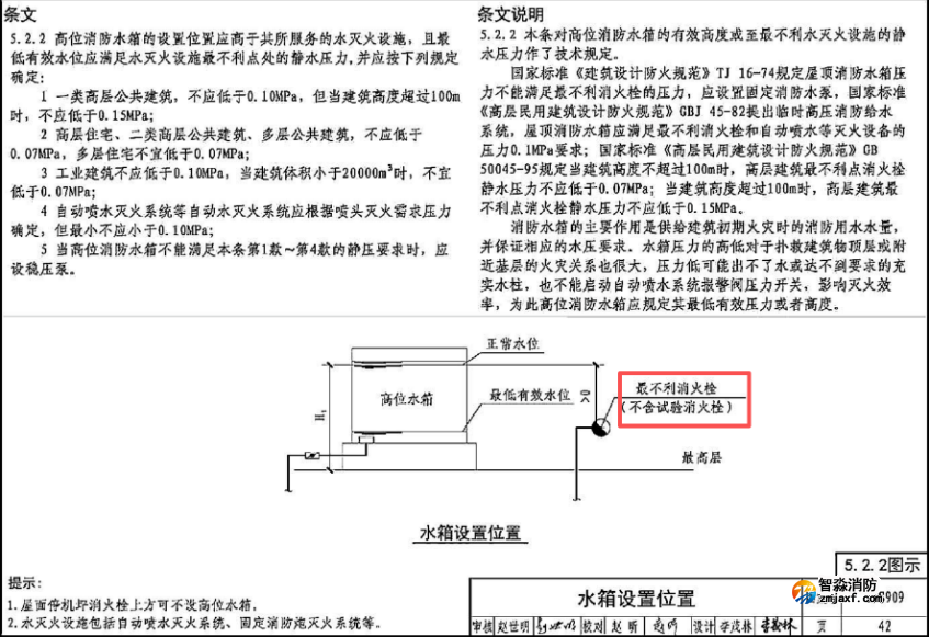 5.2.2 高位消防水箱的設(shè)置位置應(yīng)高于其所服務(wù)的水滅火設(shè)施,且最低有效水位應(yīng)滿足水滅火設(shè)施最不利點(diǎn)處的靜水壓力,并應(yīng)按下列規(guī)定確定:
