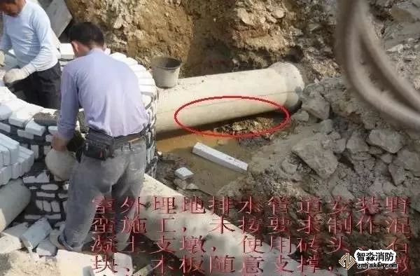 室外埋地排水管道未做基礎(未按要求制作混凝土支墩,使用磚頭、石塊、木板隨意支撐,管底懸空)。