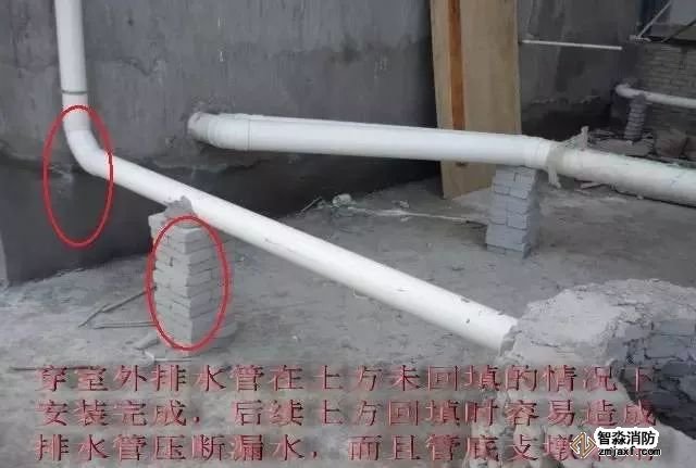 ①室外土方沒有回填,埋地塑料排水管已經敷設完成,施工程序顛倒。