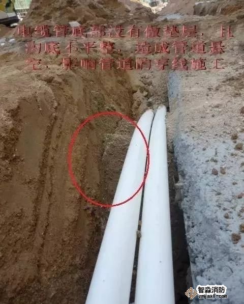 ①電纜溝體沒有完全開挖,溝底的土方沒有清理的情況下,敷設電纜導管。