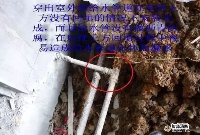 ①室外土方沒有回填,給水管已經敷設完成,施工程序顛倒。