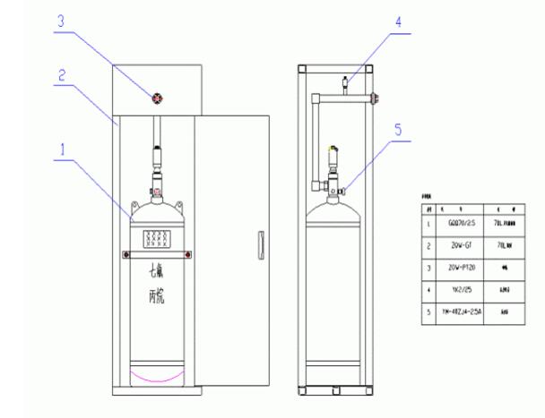 機(jī)房:由設(shè)計用量W=170kg,選用2套GQQ90/2.5型柜式滅火裝置,根據(jù)我公司產(chǎn)品氣體滅火系統(tǒng)設(shè)計手冊90L每瓶充裝85 kg。