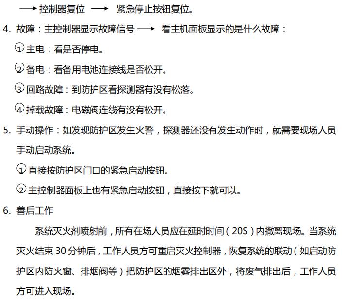若因探測(cè)器誤動(dòng)作發(fā)出火災(zāi)聲光報(bào)警,在查看現(xiàn)場(chǎng)確定無(wú)火情后可按下手動(dòng)控制盒內(nèi)或控制器上的緊急停止按鈕,阻止控制器滅火指令的發(fā)出,不啟動(dòng)滅火裝置,以免造成不必要的浪費(fèi)和混亂。