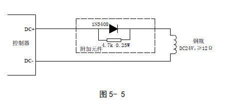 GST-QKP01 驅(qū)動(dòng)鋼瓶電磁閥輸出的布線方式如圖5-5所示。附加元件應(yīng)置于線路的末端、接近鋼瓶電磁閥處。
