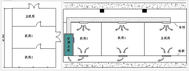 如下圖所示,若三個(gè)房間從吊頂?shù)降匕宥疾捎锚?dú)立的空調(diào)系統(tǒng),那么將機(jī)房1和機(jī)房2劃作一個(gè)區(qū)域或劃為兩個(gè)單獨(dú)滅火區(qū)都是可行的。但如果采用一臺精密空調(diào)為三個(gè)房間服務(wù)且為“上送風(fēng),地板下回風(fēng)”方式這三個(gè)房間就必須劃分成一個(gè)滅火區(qū)域,藥劑儲備應(yīng)該是上者的3倍或1.5倍,對工程的投資影響是比較大的。除過滅火劑和噴放管道布置要作為一個(gè)保護(hù)區(qū)考慮外,探測范圍也應(yīng)該分塊進(jìn)行探測但還是一個(gè)探測區(qū)域,警報(bào)區(qū)域也應(yīng)該按照一個(gè)區(qū)域來設(shè)置和聯(lián)動。