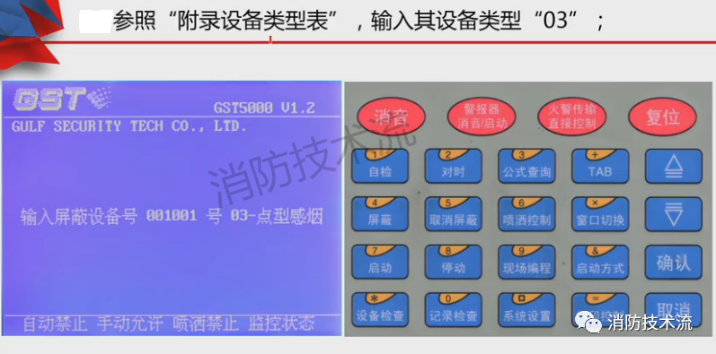輸入需要屏蔽的設(shè)備編號(hào)六位數(shù)字以及設(shè)備類型編碼,如001001號(hào)點(diǎn)型探測(cè)器代碼為03