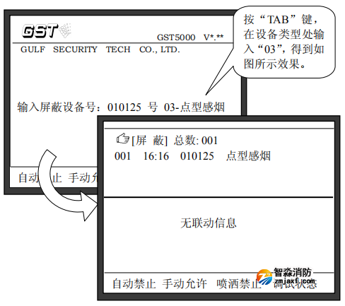 注意:在進(jìn)行消防主機(jī)“屏蔽”操作中輸入設(shè)備的編碼時(shí),可以使用通配符“*”,“*”代表這一位可以是0~9中的任意一個(gè)數(shù)字,這個(gè)功能可以方便的將一類(lèi)設(shè)備取消屏蔽。例如:如果要屏蔽掉系統(tǒng)中所有的點(diǎn)型感煙火災(zāi)探測(cè)器,我們可以在屏蔽操作時(shí)輸入:“******”,“TAB”,“03”,這樣所有點(diǎn)型感煙火災(zāi)探測(cè)器將被屏蔽。其中“03”為點(diǎn)型感煙火災(zāi)探測(cè)器設(shè)備類(lèi)型代碼。